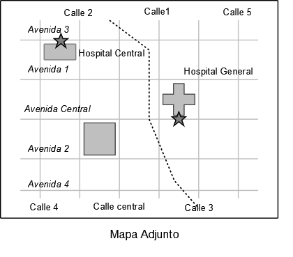 - a. Muestre la ruta más corta que tomarían las ambulancias desde el Hospital Central y desde el Hospital General para llegar a un accidente que se produce en la intersección de la Avenida 4 y Calle 4. Cuál ambulancia recorre menos distancia ? Tome en cuenta que la puerta del hospital se encuentra a media cuadra.