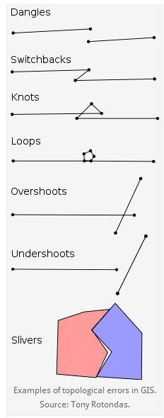La ubicación incorrecta de datos geográficos puede ir desde errores de ubicación menores hasta errores geográficos mayores. Los primeros son generalmente el resultado de digitalización descuidada; y los segundos son debido a cambios de escala u origen originados por problemas de software o hardware.