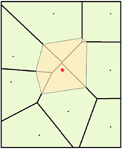 Los vecinos cercanos de cualquier punto son los asociados a los polígonos de Voronoi (Thiessen) vecinos. Inicialmente, se construye un diagrama de Voronoi con todos los puntos dados. A continuación, se crea un nuevo polígono de Voronoi, alrededor del punto de interpolación. La proporción de solapamiento entre este nuevo polígono y los polígonos iniciales se utiliza entonces como pesos.
